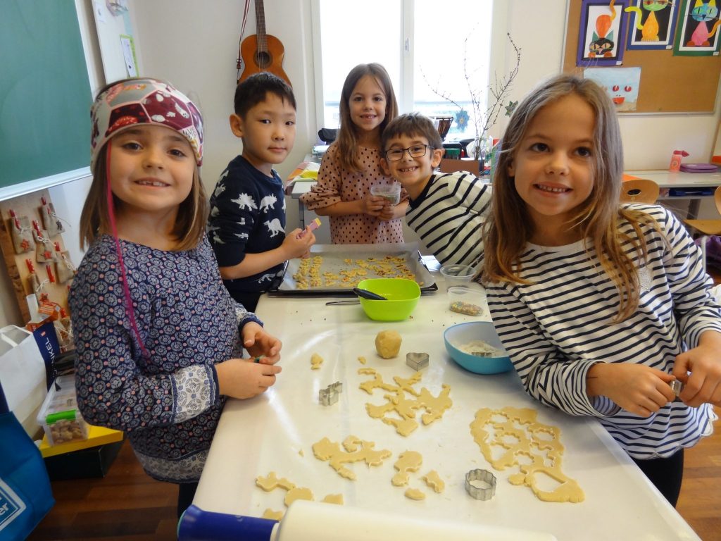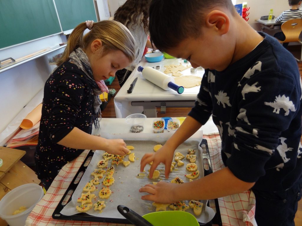 Im Advent wurde die 1a-Klasse an einem Vormittag zur „Weihnachtsbäckerei“. Mit großem Eifer stachen die Kinder Kekse aus und verzierten diese nach dem Einpinseln mit Streuseln. Die vollen Bleche durften wir zum Backen in die Küche im SPZ bringen. Die Kinder waren sich beim Verkosten einig: Mmmm, lecker!!!