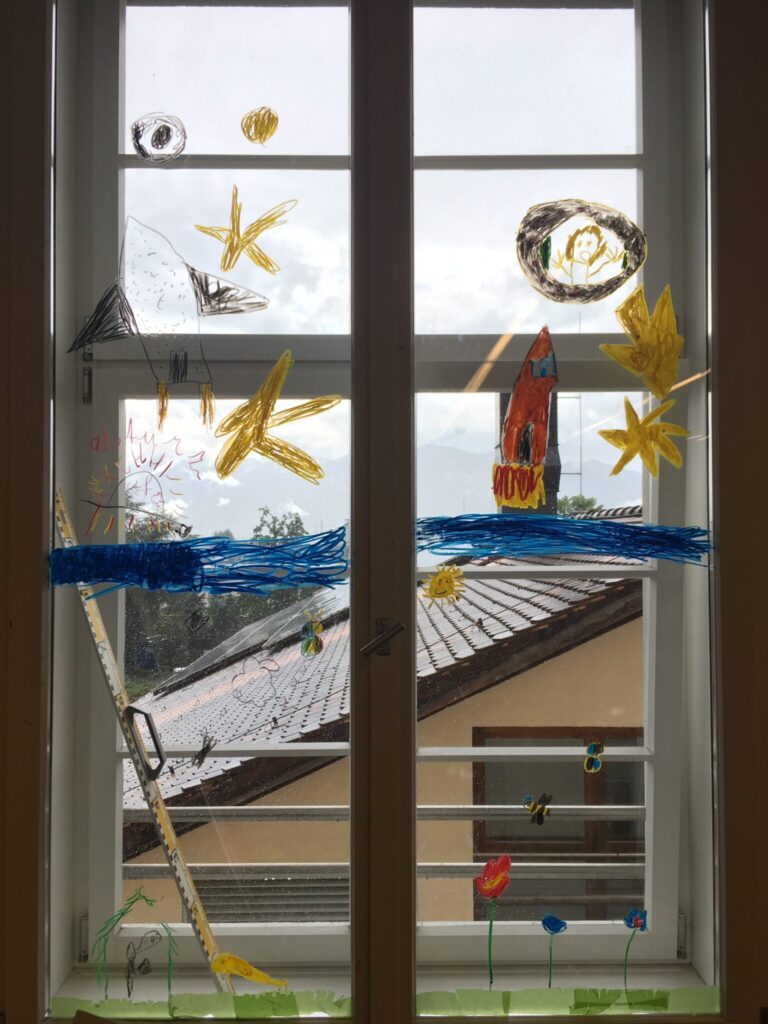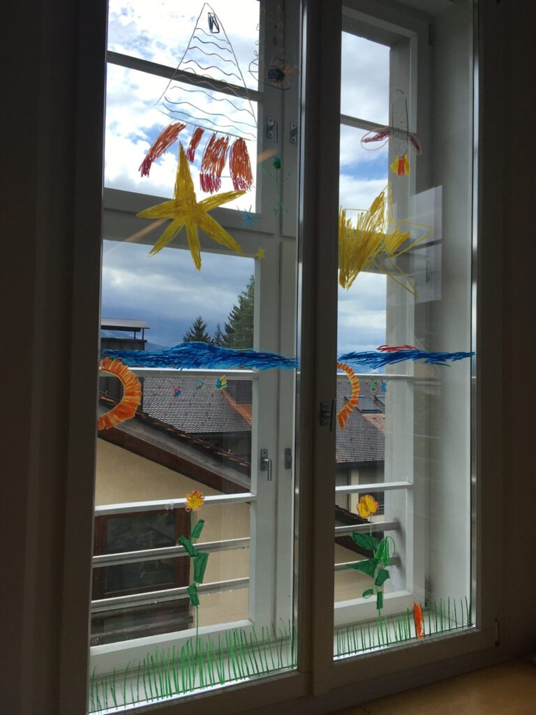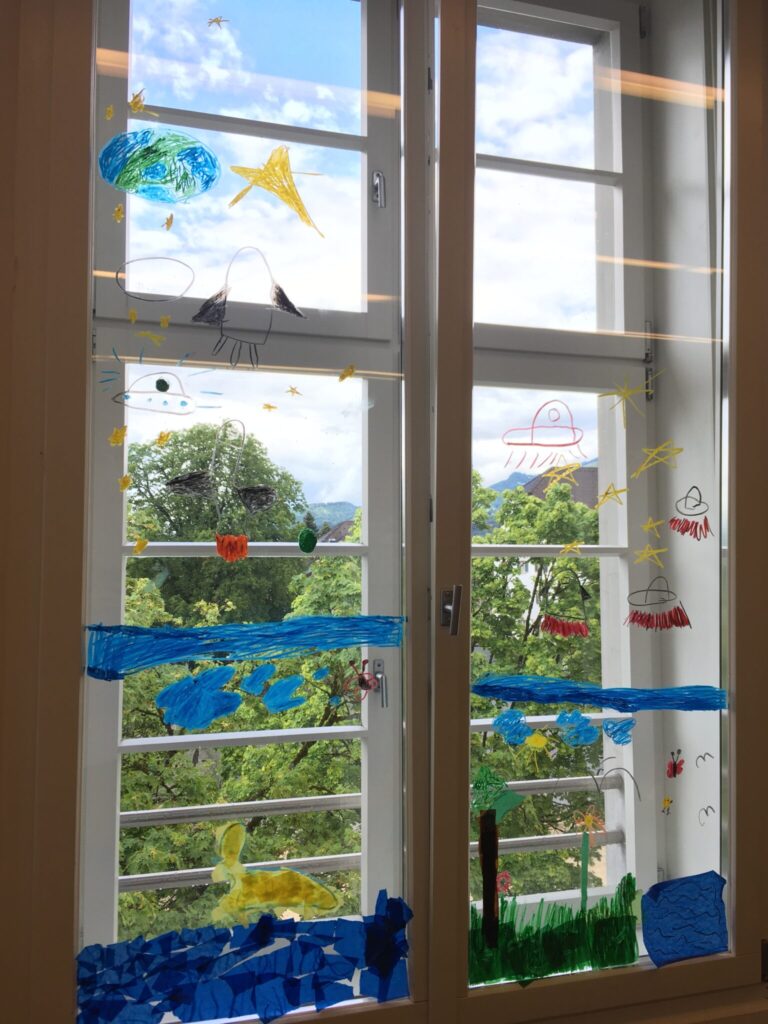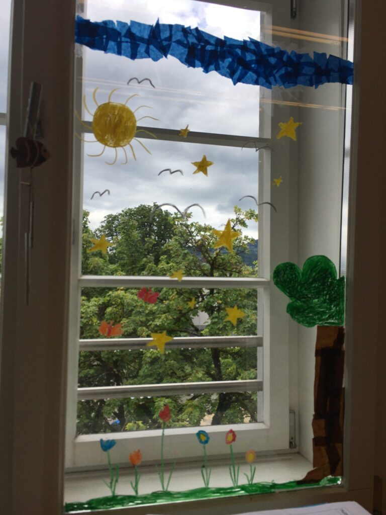 Die 2b nutzte die Zeit um die Fenster im Klassenzimmer zu gestalten. Mit fröhlichen Farben durften die Zweitklässler eine bunte Sommerwiese malen. Was für ein schöner Anblick!